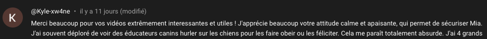 "J'ai adopté de nombreux chiens dans ma vie, mais je dois dire que votre approche a été un vrai coup de cœur. Mon vieux toutou est beaucoup plus apaisé grâce à vous, un immense merci"